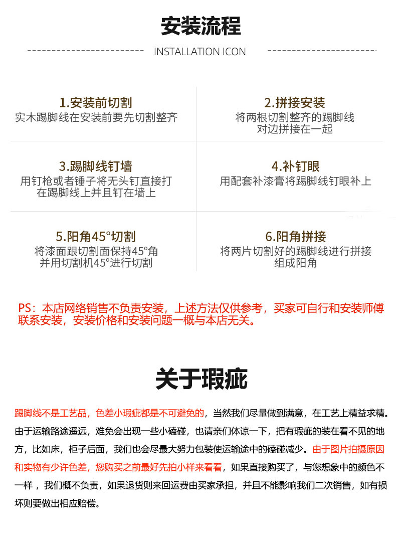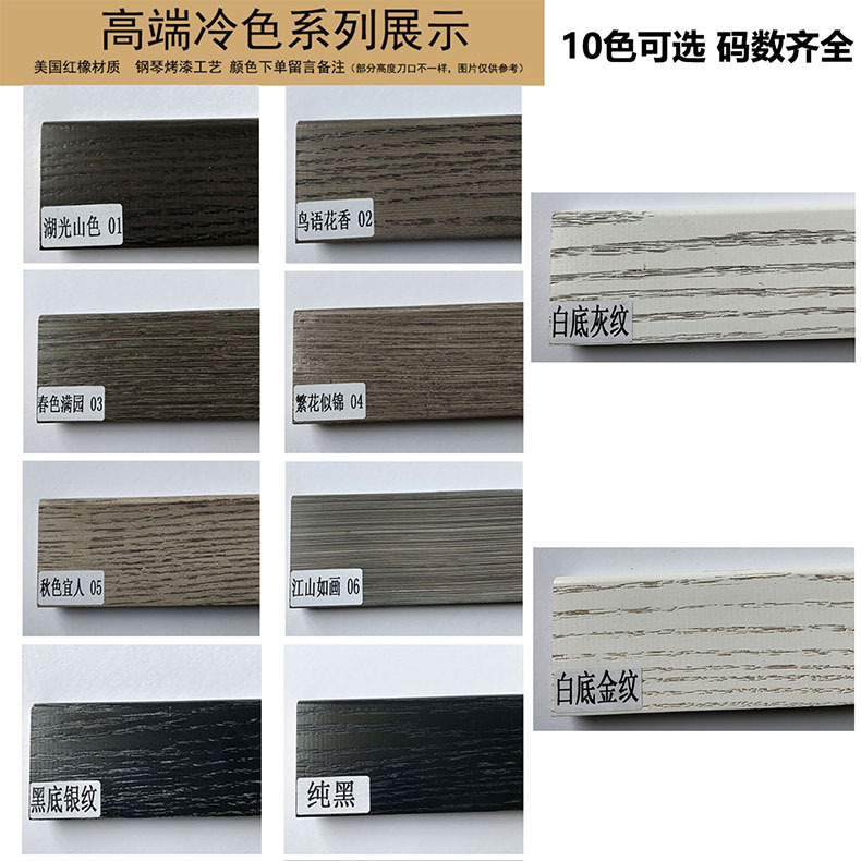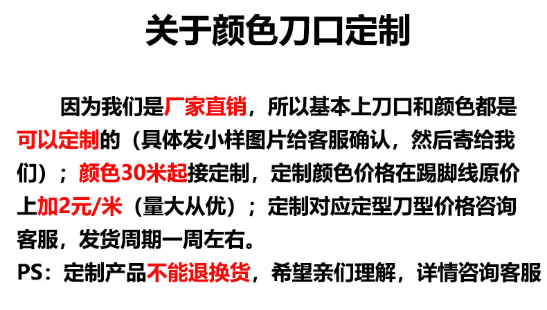 各种颜色和刀型均可定制(具体发样品图片给客服确认,然后邮寄给我们);颜色30米起接定制,定制颜色价格在踢脚线原价上加2元/米(量大从优);定制对应刀型价格咨询客服,发货周期一周左右。